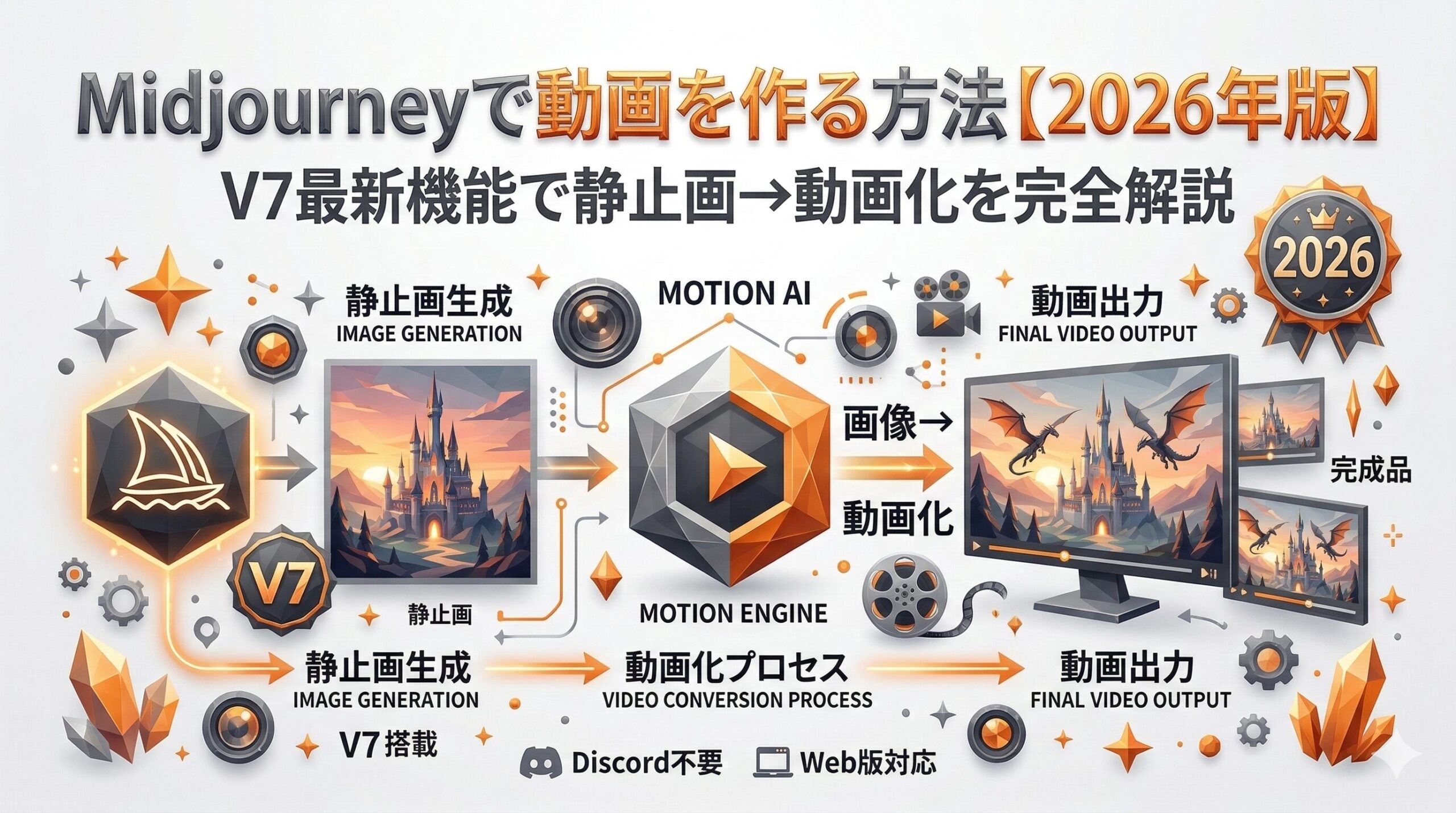 👇画像②: Midjourney動画生成の操作フロー(ローポリゴンスタイル・オレンジ×グレー)