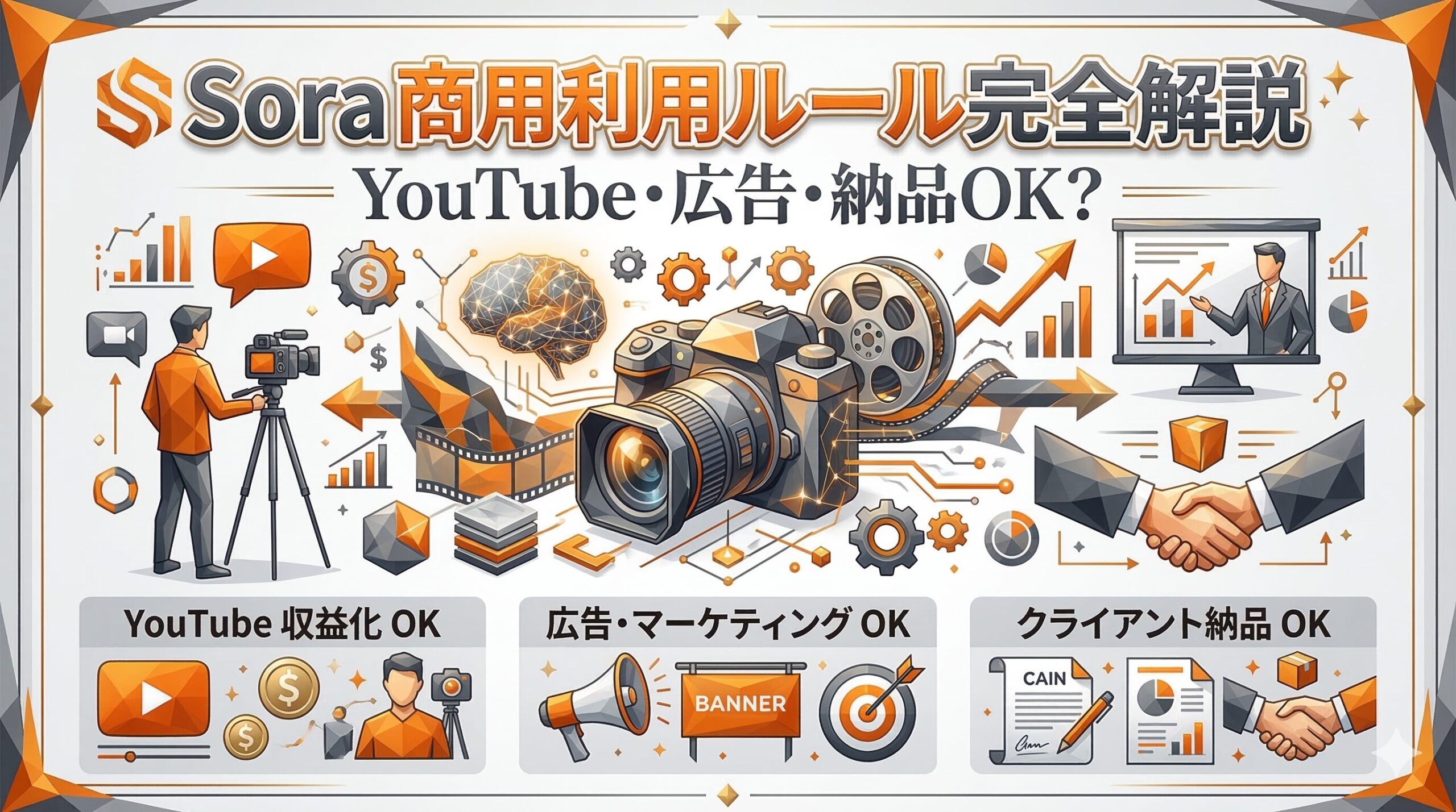 Soraの商用利用はOpenAIの利用規約を守る範囲で幅広く認められています。YouTube収益化・広告・クライアント納品・ストックフッテージ販売すべてOKです。